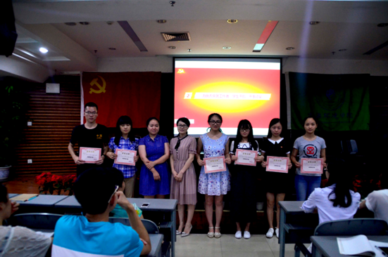 表彰先进个人,树立先锋模范。李书记对学院党员示范岗学生党员进行授牌,为张萍、刁欣、吴飞亚颁发“优秀党务工作者”证书以示祝贺。